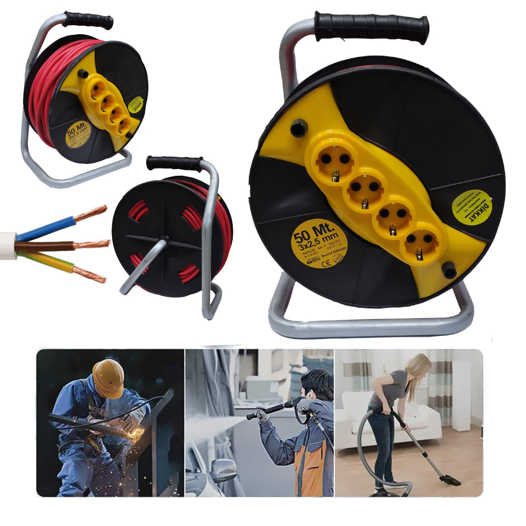 Produžni kabel na kolutu za napajanje više uređaja na jednom mjestu. Kabel je dug 50 metara. Dolazi s 4 utičnice i toplinskim osiguračem.