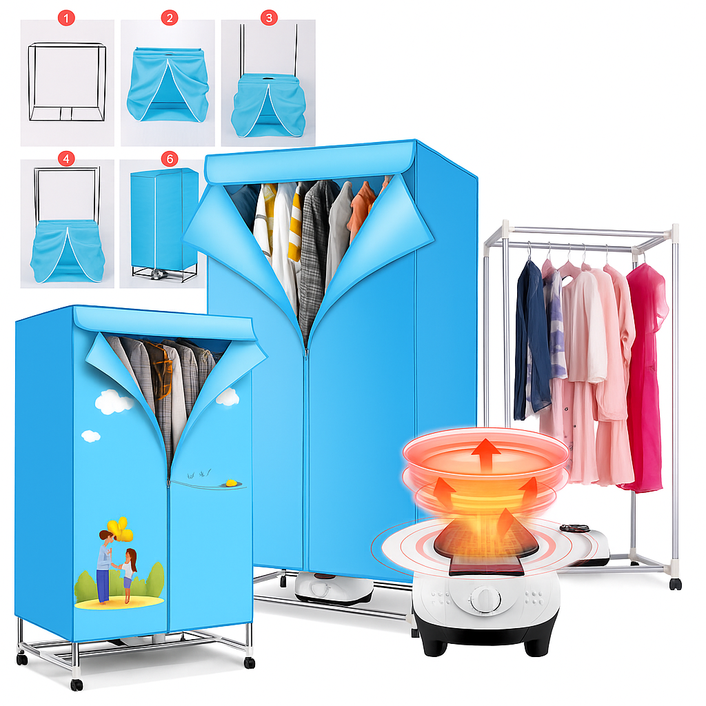 Mini sušilica idealno je rješenje za apartmane, male stanove, kamp prikolice, kampere te sušenje u zatvorenom prostoru ili balkonu. Najbolja prijenosna kombinacija sušilice i ormara za spremanje odjeće u jednom!