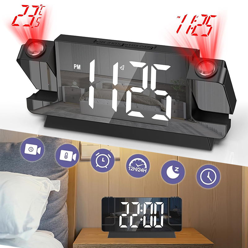 Ova moderna budilica nudi praktične značajke za svakodnevnu upotrebu, uključujući dvostruku projekciju vremena i temperature te veliki, čitljiv LED zaslon. Uz funkciju USB punjenja i prilagodljive razine svjetline, savršeno će se uklopiti u vašu spavaću sobu ili ured.
