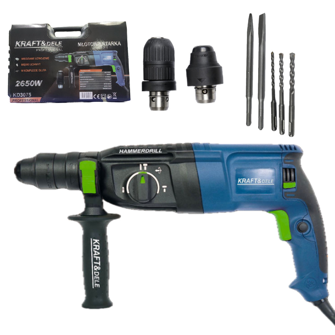 SDS plus udarna bušilica Kraft&Dele KD3075 pruža visoku snagu i učinkovitost zahvaljujući motoru od 2650W, što je čini idealnim alatom za teške radne uvjete. Ova bušilica omogućava rad u tri načina: bušenje s udarcem, bušenje bez udarca i klesanje, čime postaje svestran alat za različite vrste zadataka, od bušenja betona do preciznog klesanja.