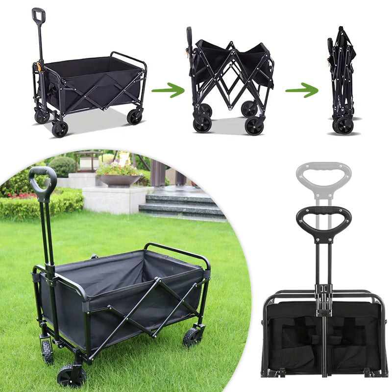Velika sklopiva kolica za plažu idealan su izbor za obiteljski odmor, kampiranje i putovanja. S kapacitetom od 100 litara i nosivosti do 100 kg, omogućuju vam prijevoz gotovo svega što vam je potrebno. Stražnja vrata koja se otvaraju omogućuju lakši pristup predmetima, dok tri džepa (dva vanjska i jedan unutarnji) pružaju dodatni prostor za pohranu. Čvrsta konstrukcija i visokokvalitetni materijali osiguravaju dugotrajnost i izdržljivost.