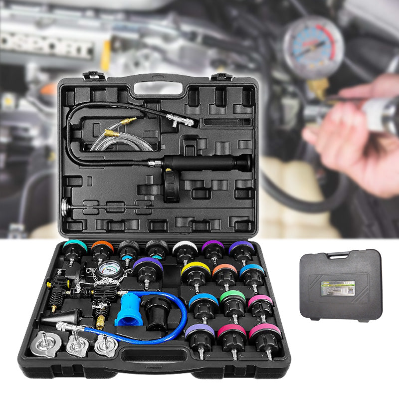Tester za ispitivanje propuštanja rashladnog sistema je 27-dijelni komplet dizajniran za profesionalno testiranje tlaka u hladnjaku i efikasnu izmjenu rashladne tekućine. Komplet uključuje testne čepove raznih boja, što olakšava identifikaciju i odabir pravog čepa za specifično vozilo.Glavne karakteristike: