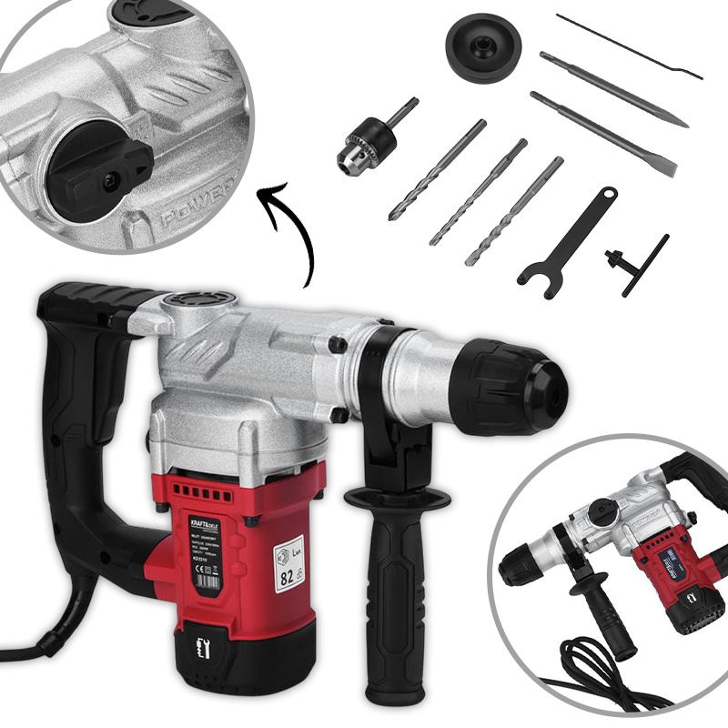 Udarna bušilica-štemerica | 2800W SDS-PLUS je snažan i pouzdan čekić za rušenje, namijenjen zahtjevnim građevinskim i renovacijskim radovima. S motorom od 2800 W i udarnom energijom od 6 J, omogućuje brzo bušenje, dlijetanje i klesanje čak i u najtvrđim materijalima. SDS-Plus stezna glava osigurava trenutnu izmjenu svrdla i dlijeta bez dodatnih alata.